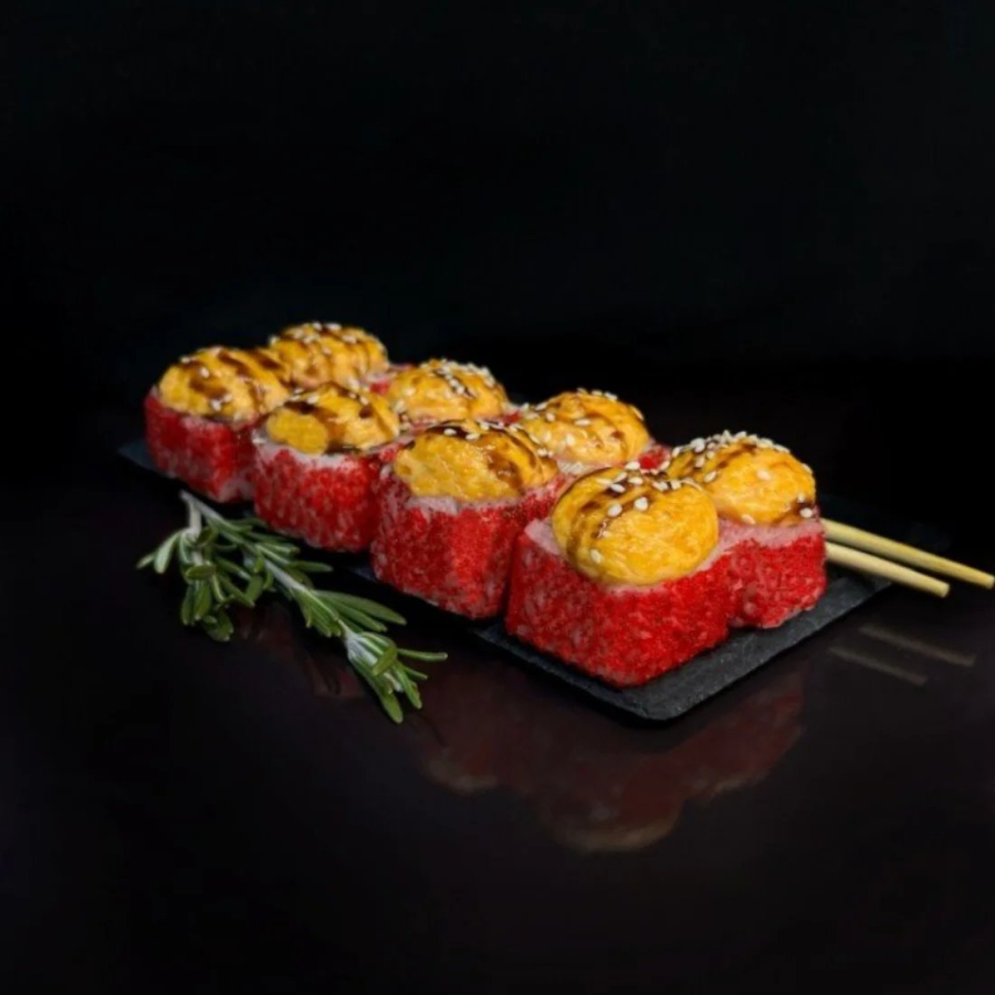Рис, нори, сыр творожный, огурец, лосось, сырная шапочка, терияки, кунжут, икра масаго красная.