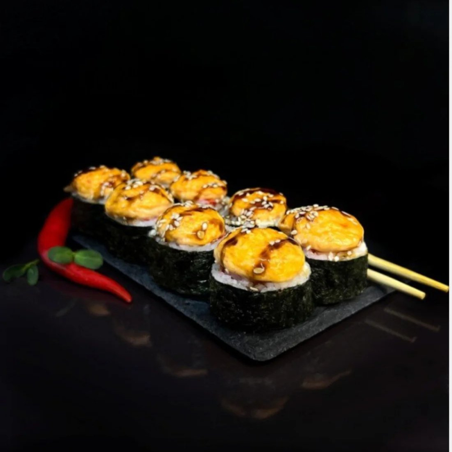 Рис, нори, сыр творожный, угорь, сырная шапочка, терияки, кунжут.