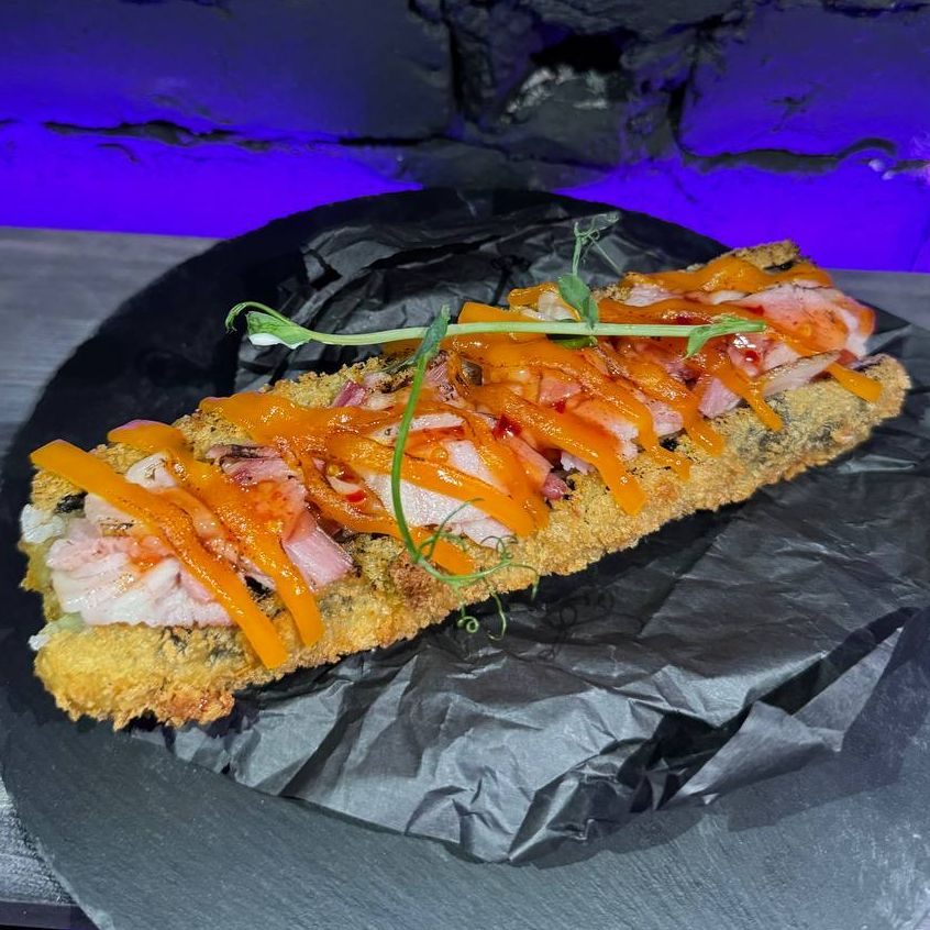 Заказать Рис, нори, темпура, творожный сыр, томат, огурец маринованный, опаленный бекон, сыр Чеддер, соус гриль, сладкий чили.