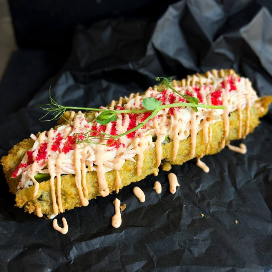 Заказать Снежный краб в соусе, авокадо, творожный сыр, соус унаги, соус спайси, икра тобико.