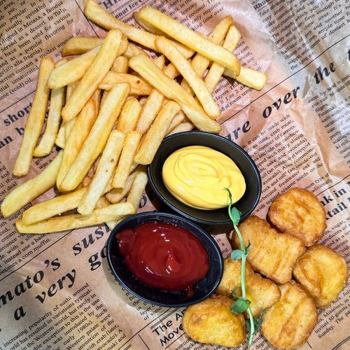 Заказать Картофель фри, луковые кольца, чикен попкорн, колбаски гриль, перец болгарский, кетчуп, сырный соус.