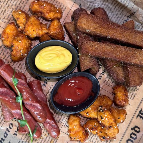 Заказать Чикен попкорн, колбаски гриль, чесночные гренки, кетчуп, сырный соус.