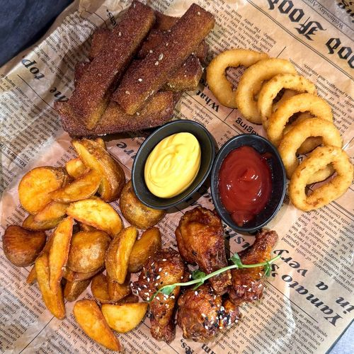 Заказать Крылья терияки, луковые кольца, картофельные дольки, чесночные гренки, кетчуп, сырный соус.