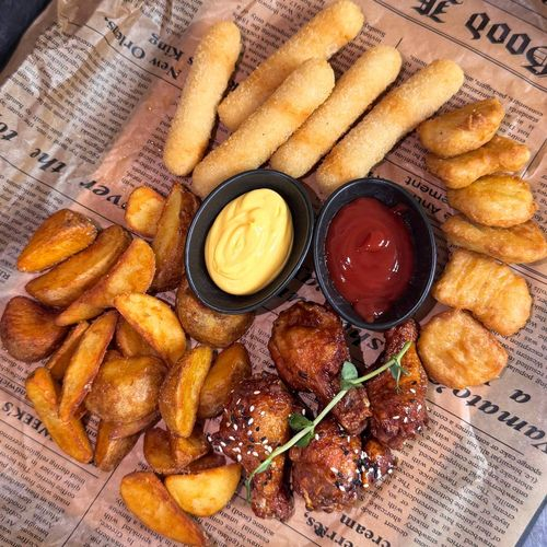 Заказать Сырные палочки, крылья терияки, картофельные дольки, наггетсы, кетчуп, сырный соус.