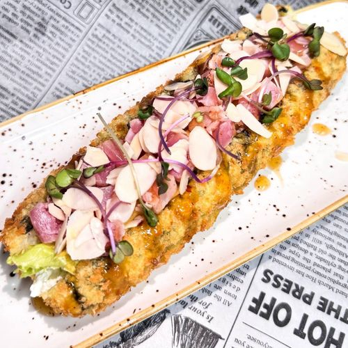 Рис, нори, темпура, творожный сыр, огурец, дайкон, лосось опален., чукка, кунжут, терияки соус.