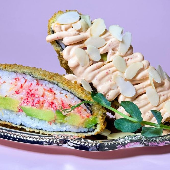 Заказать Рис, нори, темпура кляр, нежная тигровая креветка в соусе спайси с добавлением икры тобико, авокадо, разрезан на две половинки, полит соусом спайси, украшен лепестками миндаля.