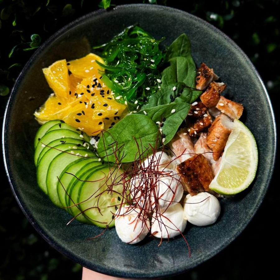 Рис для суши, угорь, огурец, апельсин, шпинат, шарики моцарелла, чука, соус унаги, кунжутно-ореховый соус, кунжут, нити чили.