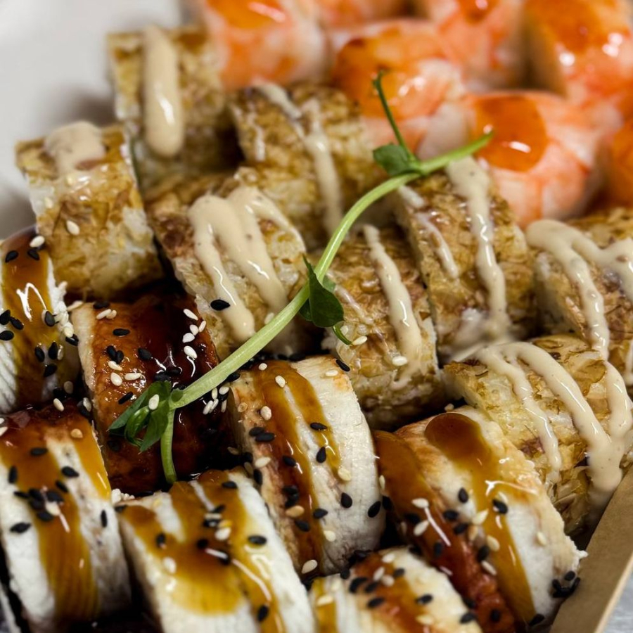 Везувий острый запеченный, Темпура сливочный, Филадельфия с огурцом, ролл чеддер-бекон, ролл Криспи. Соевый соус и васаби в подарок +2 комплекта палочек!