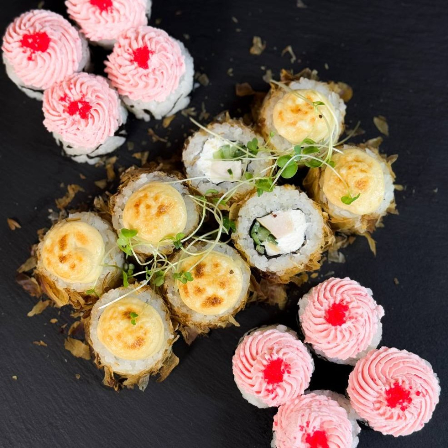 Ролл лосось-креветка (лосось, креветка, манго, айсберг, творожный сыр, терияки, сладкий чили), ролл Земфира(снежный краб-микс, огурец, икра тобико, творожный сыр), ролл Банкай (лосось, Чука, огурец, творожный сыр, ореховый соус). Соевый соус и васаби в подарок +2 комплекта палочек!