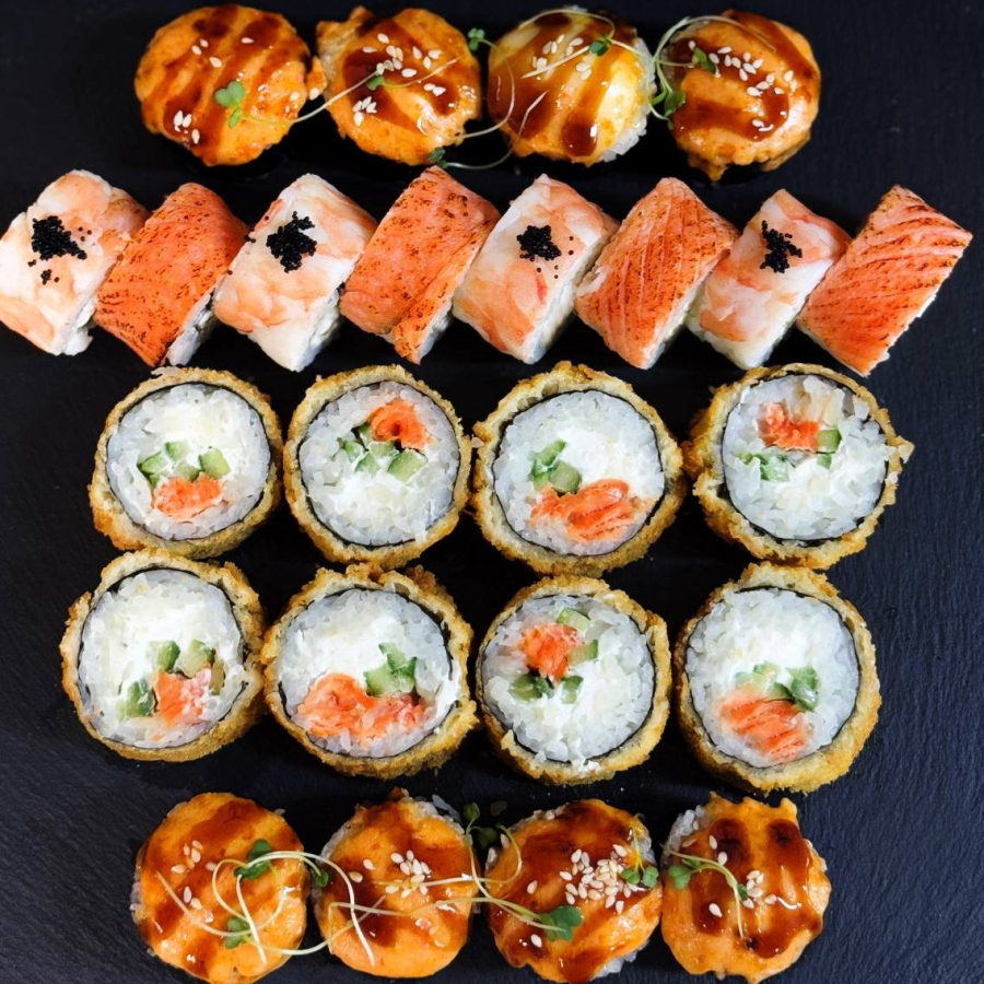 Маки с лососем и огурцом, Маки с креветкой, Маки с опаленным лососем и манго, Маки с тунцом и перцем, Маки с опаленным беконом, томатом и луком фри. Соевый соус и васаби в подарок +2 комплекта палочек!