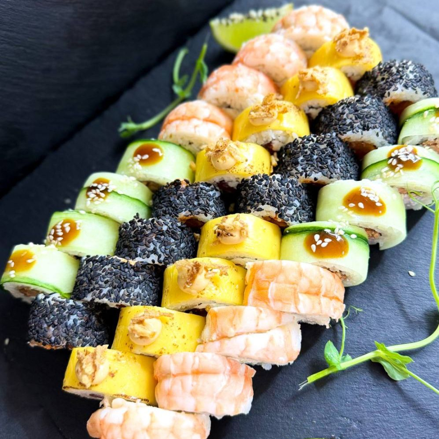 Ролл лосось-креветка (лосось, креветка, манго, айсберг, творожный сыр, терияки, сладкий чили), ролл Земфира(снежный краб-микс, огурец, икра тобико, творожный сыр), ролл Банкай (лосось, Чука, огурец, творожный сыр, ореховый соус). Соевый соус и васаби в подарок +2 комплекта палочек!