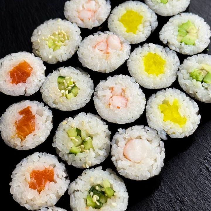 Маки с лососем, маки с креветкой, маки с огурцом, маки с авокадо, маки с такуаном. Соевый соус и васаби в подарок +2 комплекта палочек!