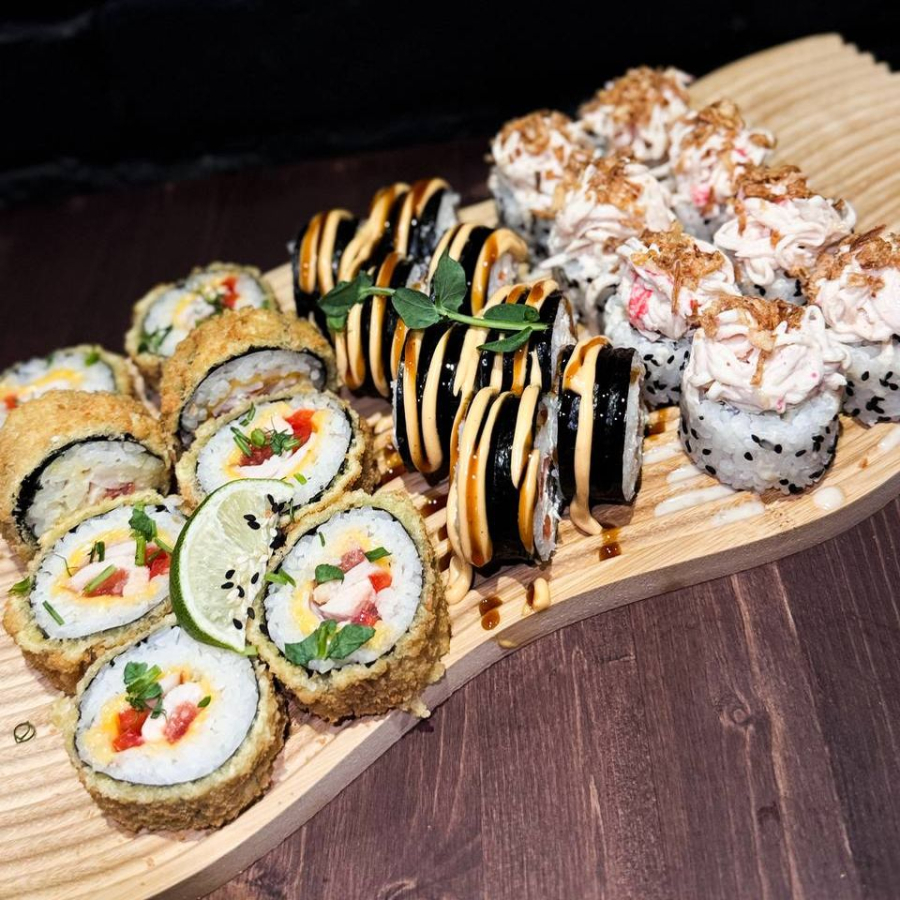 Ролл Маки с лососем и огурцом, ролл Темпура с курицей (копченая курица, перец болгарский, томат, чеддер, острый соус кимчи), ролл с тамаго и снежным крабом (снежный краб-микс, творожный сыр, блинчик тамаго, томат, кунжут, лук фри, соус орехово‑кунжутный). Соевый соус и васаби в подарок +2 комплекта палочек!