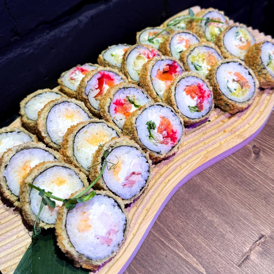 1 (творожный сыр, манго, айсберг, лосось татаки, креветка);2 (творожный сыр, тунец, огурец, дайкон);3 (творожный сыр, снежный краб, чукка, тобика);4 (перец, томат, курица, бекон опален., чеддер опален.);5 (креветка темпура, творожный сыр, огурец, кунжут).Соевый соус и васаби в подарок +2 комплекта палочек!