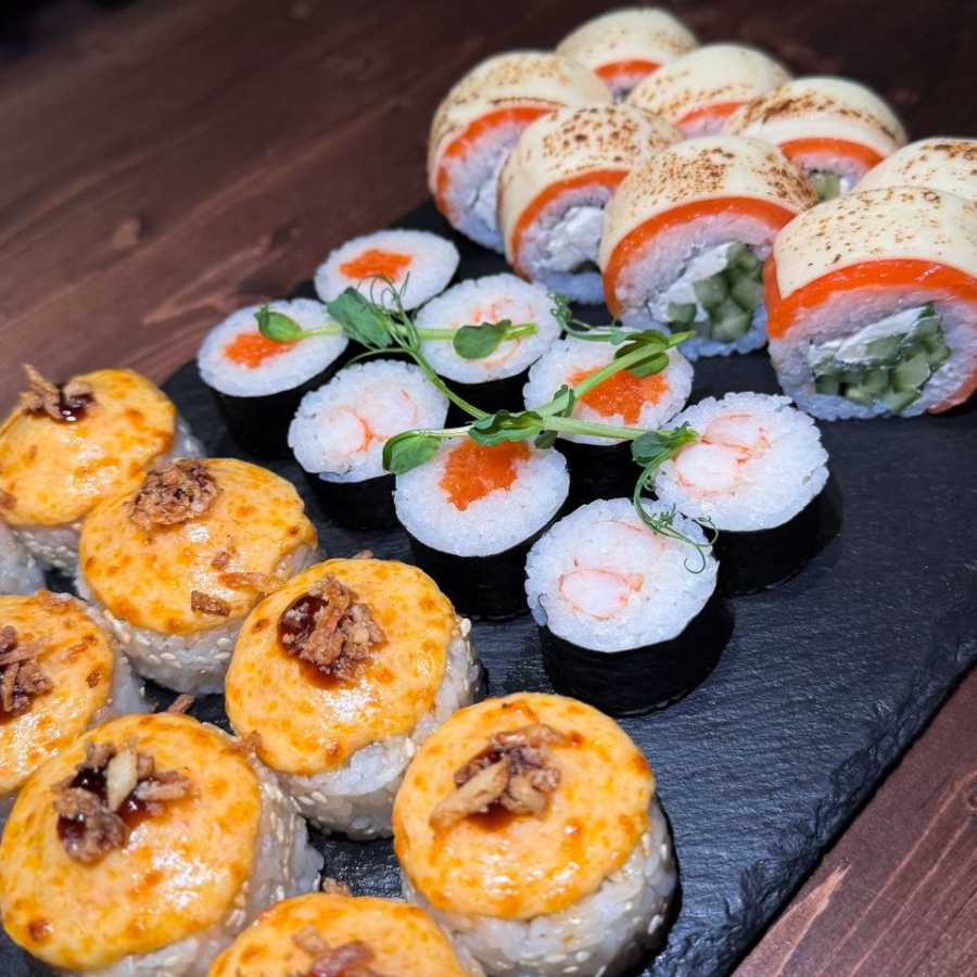 Заказать Мини ролл с лососем и креветкой, запеченный ролл с беконом(рис, нори, бекон, томат, лук фри, творожный сыр, сырная шапочка), Фила эмменталь (рис, нори, лосось, творожный сыр, огурец, сыр эмменталь). Соевый соус и васаби в подарок +2 комплекта палочек!