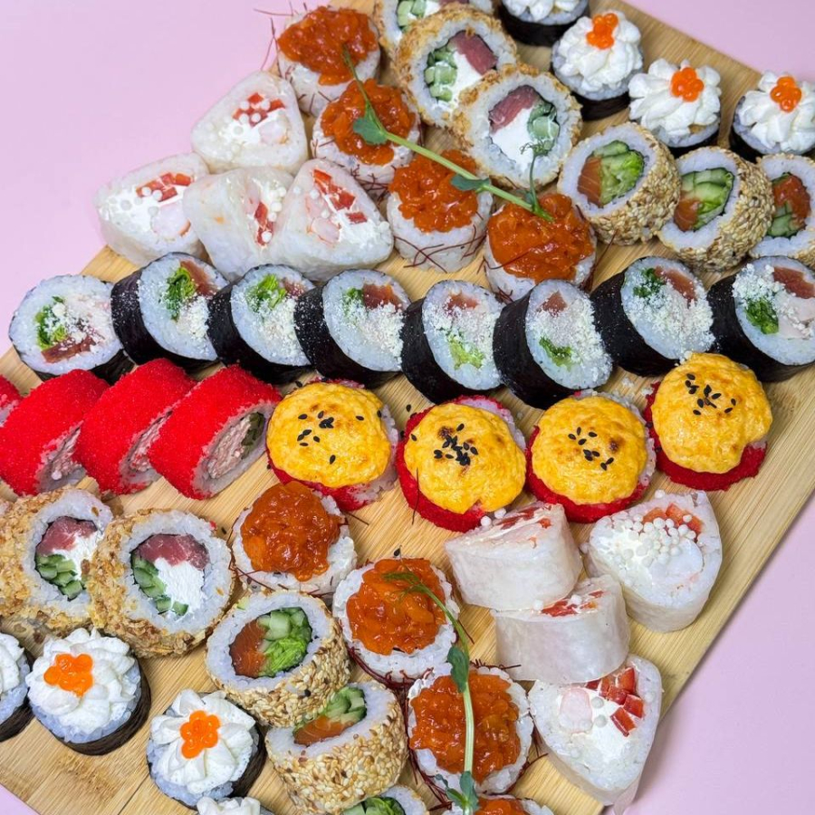 Заказать Калифорния (рис, нори, огурец, краб-микс, икра тобико, сырная шапочка). Маки цезарь (рис, нори, курица копченая, салат айсберг, томат, пармезан). Ролл Кензо (рис, нори, лосось, огурец, салат айсберг, кунжут). Мини мак с креветкой темпура (рис, нори, креветка в темпуре, икринка, икра имитация). Ролл Венера (рис, рисовая бумага, креветка , болгарский перец, творожный сыр). Хьюмен (рис, нори, творожный сыр, тунец, огурец, лук фри). Ролл тартар лосось кимчи (рис, нори, творожный сыр, шапочка из нарезанного лосося в соусе кимчи). Соевый соус и васаби в подарок +2 комплекта палочек!