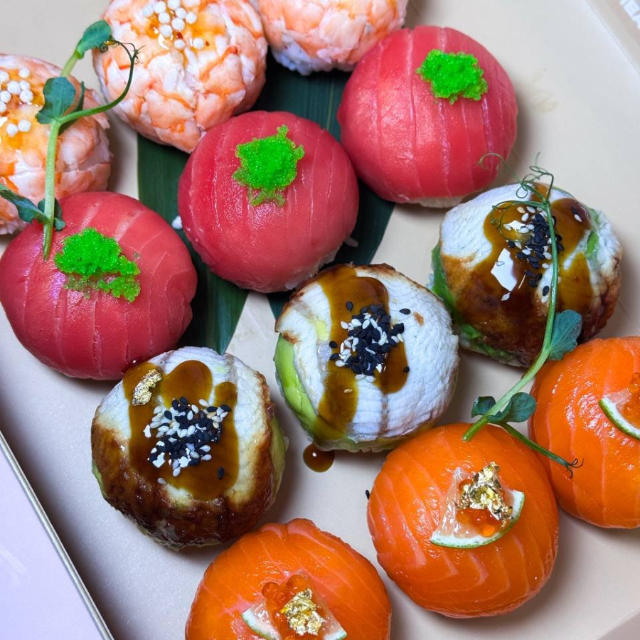 Заказать Ролл Болл с креветкой (рис, творожный сливочный сыр, манго, тигровая креветка, соус сладкий чили). Ролл Болл с лососем( рис, творожный сливочный сыр, огурчик, лосось, лайм, икра имитация). Ролл Болл с тунцом (рис, творожный сливочный сыр, тунец, болгарский перец, икра тобико). Ролл Болл с угрем (рис, творожный сливочный сыр, авокадо, угорь, соус унаги, кунжут). Соевый соус и васаби в подарок +2 комплекта палочек!