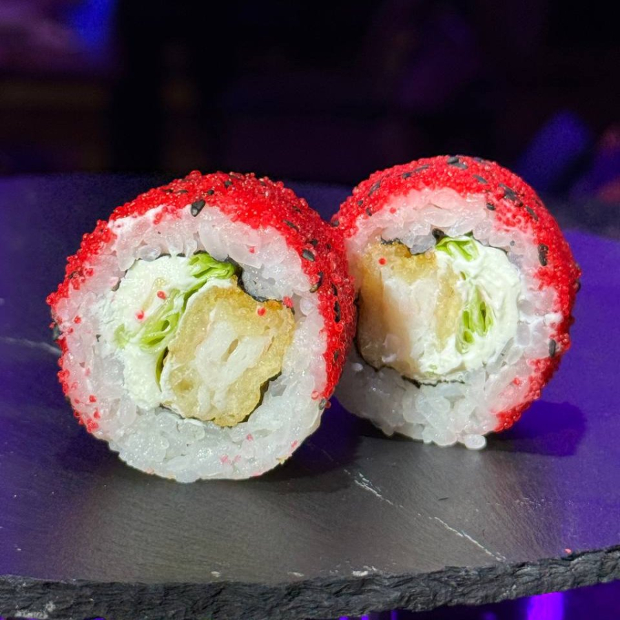 Заказать Креветка в темпуре, творожный сыр, салат айсберг, икра тобико. Японский гарнир не входит в стоимость!