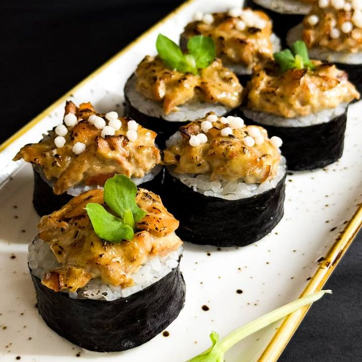 Заказать Рис, нори, огурец, салат Айсберг, опалённая шапочка из лосося терияки. Японский гарнир не входит в стоимость!