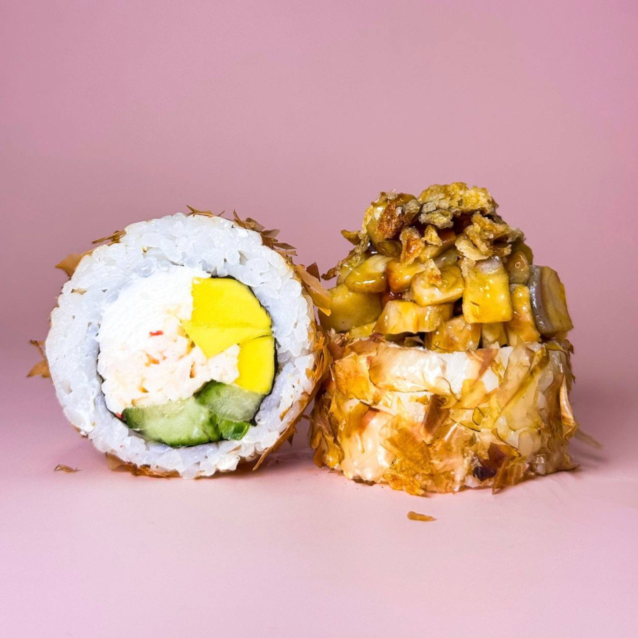 Заказать Рис, нори, творожный сливочный сыр, краб-микс, авокадо, стружка тунца, шапочка из угря в соусе унаги, украшен кранч‑луком. Японский гарнир не входит в стоимость!