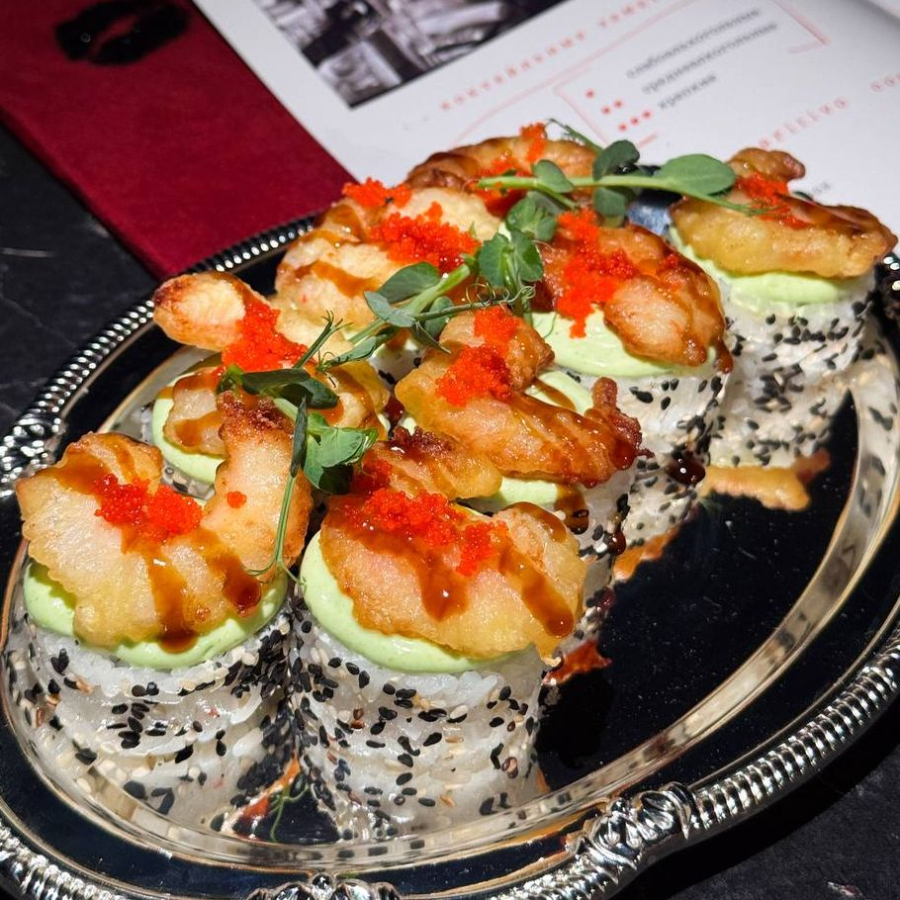Рис, нори, творожный сливочный сыр, краб-микс, огурец, кунжут, соус свит васаби, креветка в темпуре, икра тобико, соус терияки. Японский гарнир не входит в стоимость!
