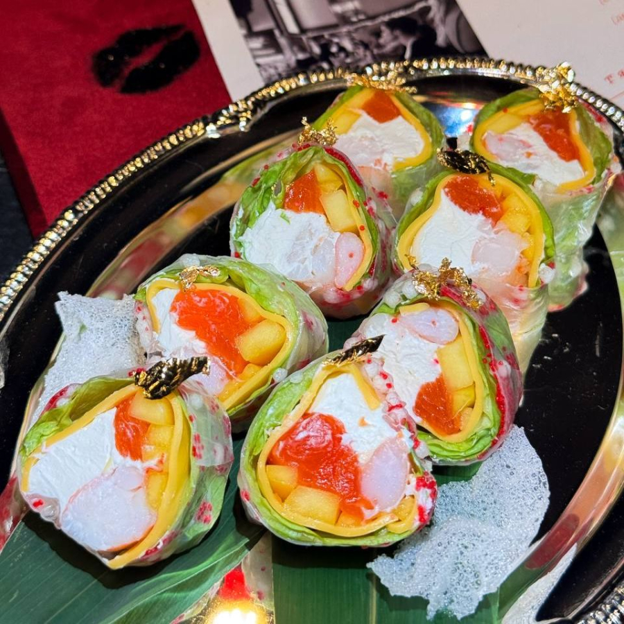 Рисовая бумага, творожный сливочный сыр, лосось, креветка, сыр чеддер, манго, салат айсберг, икра тобико, шарики арарэ. Японский гарнир не входит в стоимость!