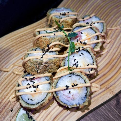 Лосось, творожный сыр, томат, салат айсберг, икра тобико, соус терияки, кунжут, темпура кляр. Японский гарнир не входит в стоимость!