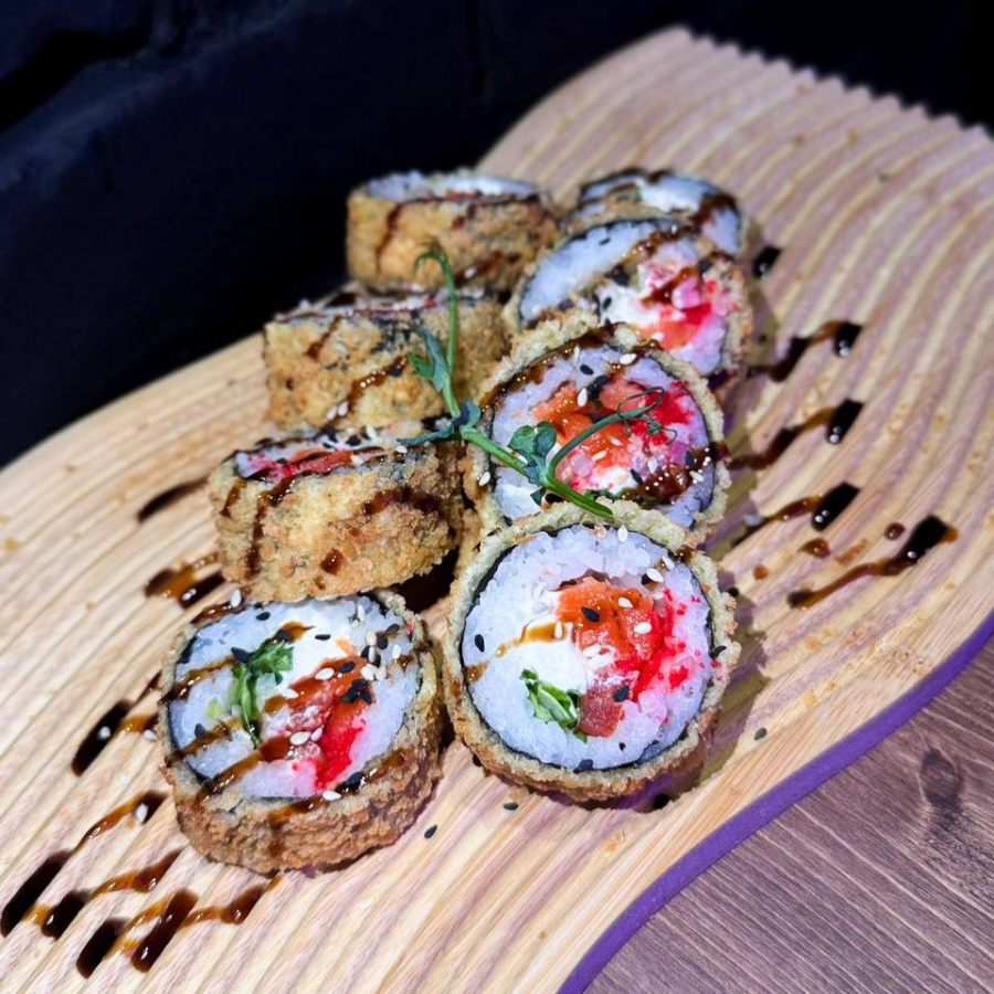 Заказать Лосось, творожный сыр, томат, салат айсберг, икра тобико, соус терияки, кунжут, темпура кляр. Японский гарнир не входит в стоимость!
