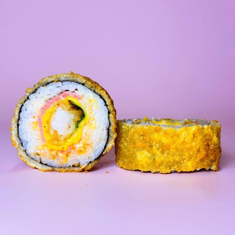 Заказать Рис, нори, темпура кляр, креветка в темпуре, соус спайси, сыр чеддер, бекон, салат айсберг. Японский гарнир не входит в стоимость!