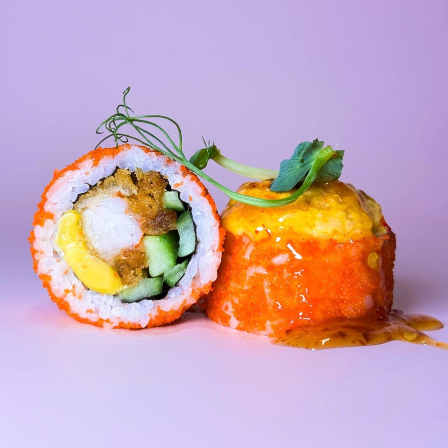 Заказать Рис, нори, креветка в темпуре, огурец, сыр чеддер, икра тобико, шапка: сырный замес, соус сладкий чили. Японский гарнир не входит в стоимость!