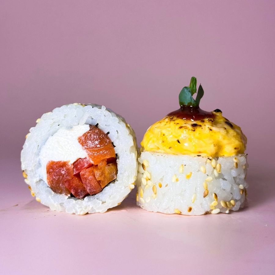 Заказать Рис, нори, творожный сливочный сыр, болгарский перец, лосось, шапочка: классический сыр, краб-микс, майонез, икра тобико. Японский гарнир не входит в стоимость!