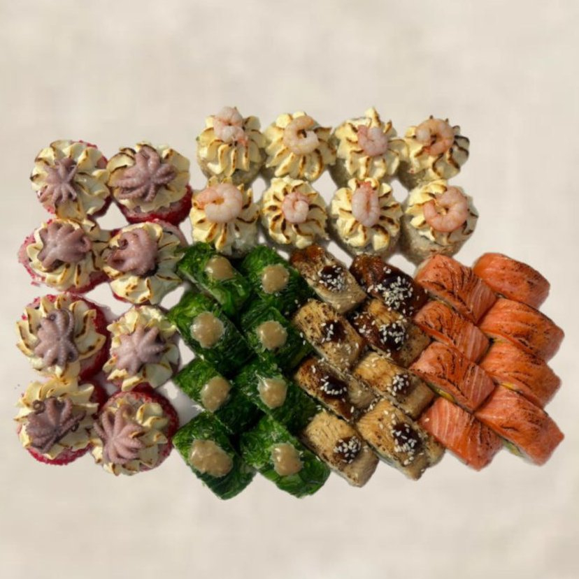 Аляска ролл, Африка ролл, курица запечённая, Калифорния темпура, Бонито с курицей.