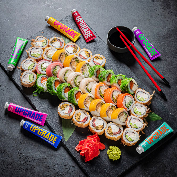 Ролл в спайси-тунце и чеддере со сливочным сыром, сладким перцем, томатами и соусом спайси (8 шт.), ролл в икре летучей рыбы и кунжутом кимчи со сливочным сыром, креветкой и огурцом (8 шт.), ролл в морском окуне со сливочным сыром, яблоком и соусом сладкий чили (8 шт.), ролл в стружке тунца со сливочным сыром, лососем и огурцом (8 шт.), ролл в кунжуте со сливочным сыром, крем-крабом, такуаном и сладким чили соусом (8 шт.).