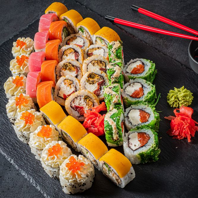 Ролл в лососе со сливочным сыром, авокадо и огурцом (4шт), ролл в креветке со сливочным сыром, авокадо и огурцом (4шт), ролл в кунжуте со сливочным сыром, крем-крабом, такуаном и сладким чили соусом (8шт), ролл в стружке тунца со сливочным сыром, тунцом и огурцом (8шт), ролл в чуке со сливочным сыром, мидиями, томатами, кунжутным соусом и кунжутом (8шт), ролл в луке кранч со сливочным сыром, креветкой в темпуре, айсбергом и соусом спайси (8шт).