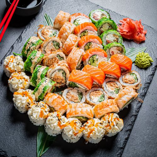 Ролл в лососе со сливочным сыром и огурцом (8 шт.), ролл в стружке тунца со сливочным сыром, лососем терияки и огурцом (8 шт.), ролл в креветке со сливочным сыром, огурцом и авокадо (8 шт.), ролл в кунжуте со сливочным сыром, краб-миксом, такуаном и сладким чили соусом (8 шт.), ролл в чуке со сливочным сыром, мидиями, томатами, кунжутным соусом и кунжутом (8 шт.)