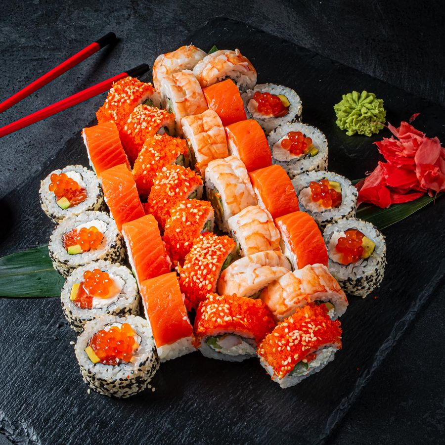 Ролл в лососе со сливочным сыром и огурцом (8шт), ролл в креветке со сливочным сыром, огурцом и авокадо (8шт), ролл в кунжуте с лососем, авокадо, сливочным сыром и икрой лосося (8шт), ролл в икре летучей рыбы со сливочным сыром, креветкой, огурцом и кунжутом кимчи (8шт).