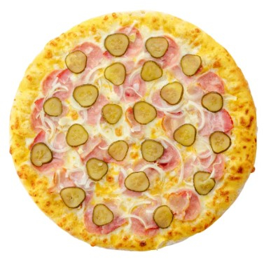 Заказать Соус для бургеров, моцарелла, ветчина, бекон, лук, соленые огурцы.