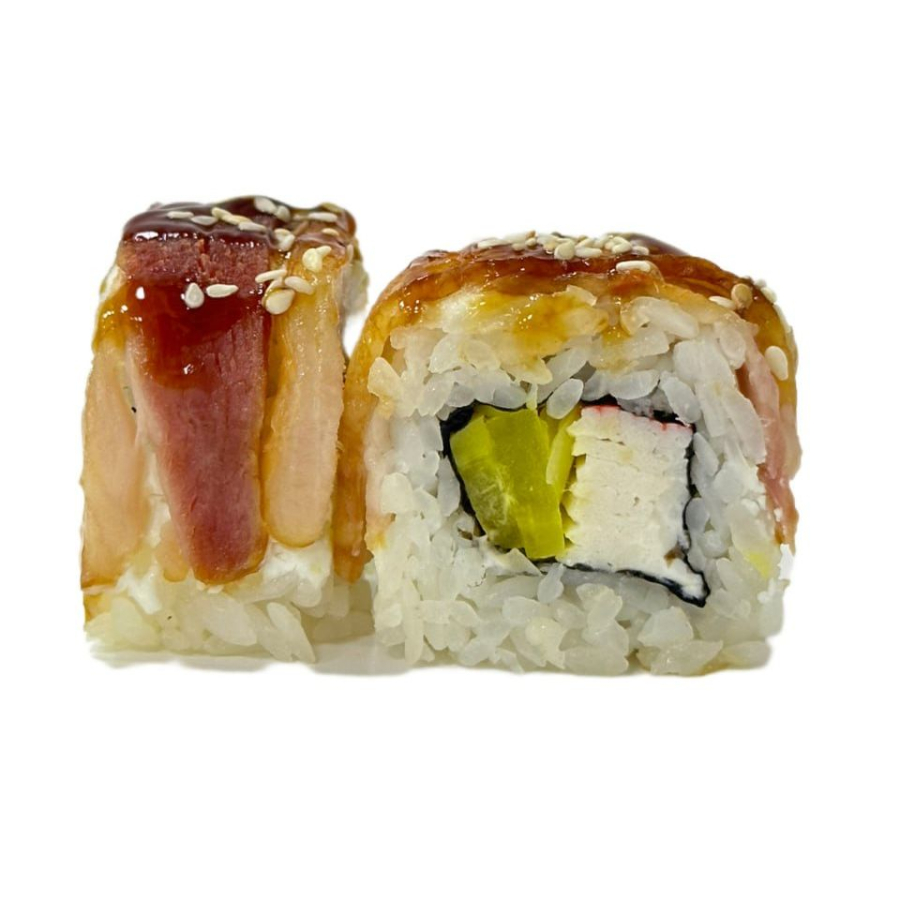 Рис, нори, сыр, тунец, креветки, салат Айсберг, икра тобико, фирменная сырная шапка.