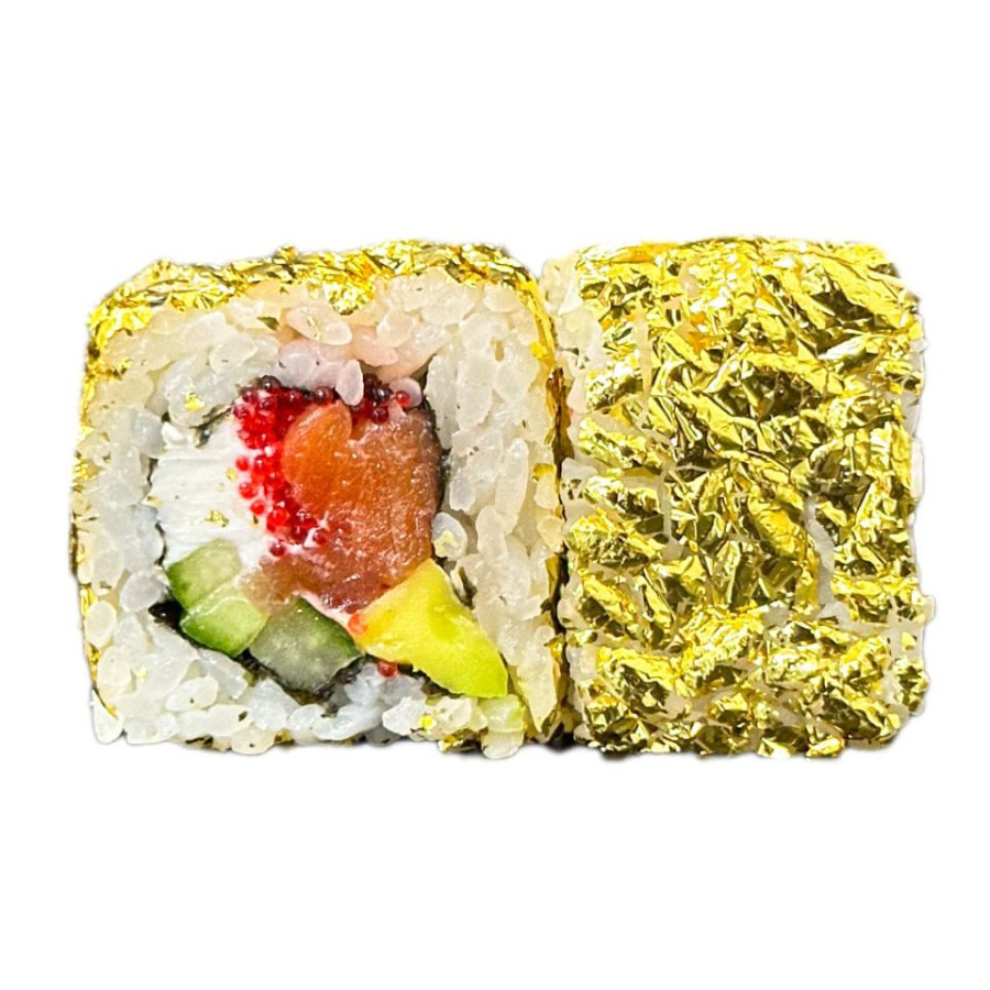Лосось, авокадо, огурец, сыр сливочный, тобико, золото пищевое, нори, рис. Палочки и соусы в комплекте не идут!