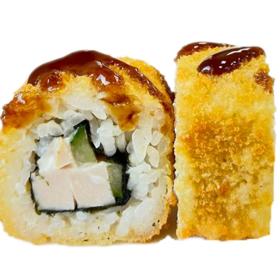 Куриный рулет, огурец, крем-чиз соус, темпура, терияки соус, нори, рис. Палочки и соусы в комплекте не идут!