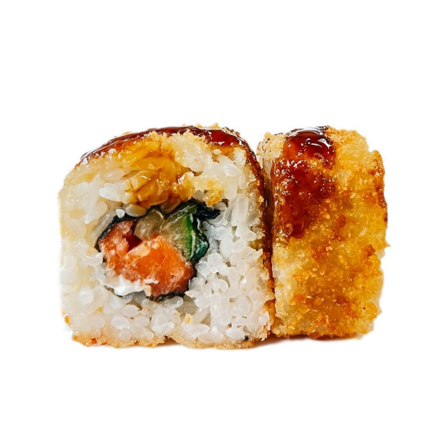 Заказать Лосось, огурец, крем-чиз соус, темпура, терияки соус, нори, рис.
