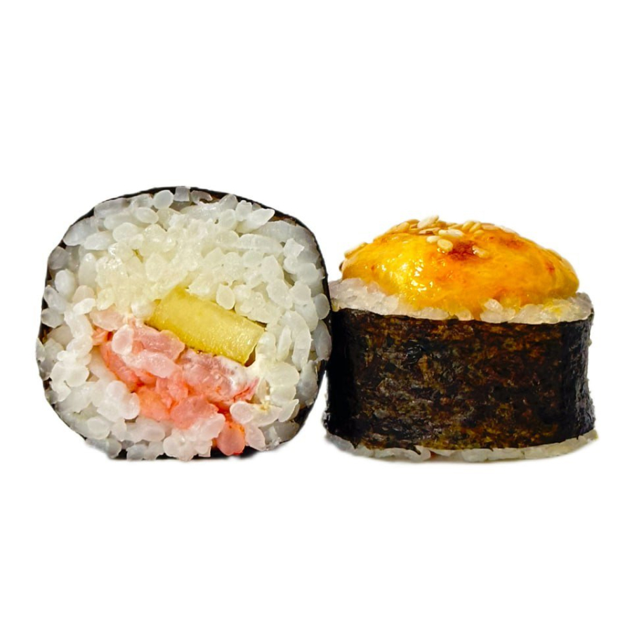 Рис, нори, мидии, сливочный сыр, огурец, фирменная сырная шапка. Палочки и соусы в комплекте не идут!