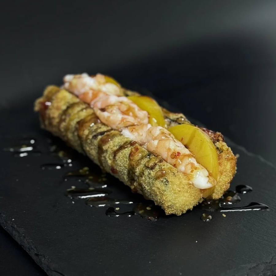 Заказать Рис, нори, сыр, сухари панко, темпурная смесь, королевская креветка, консервированный персик, остро сладкий соус и соус терияки.