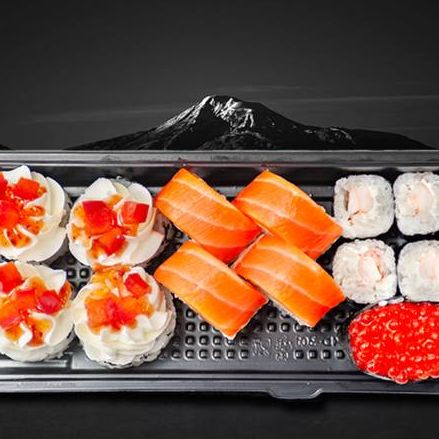 Нигири с тунцом, мини ролл с копченым лососем, ролл с африканским сомом, японским омлетом, грибами, соусом Спайси, сливочным сыром, такуаном и соусом терияки, ролл в креветке со сливочным сыром, огурцом и икрой летучей рыбы.