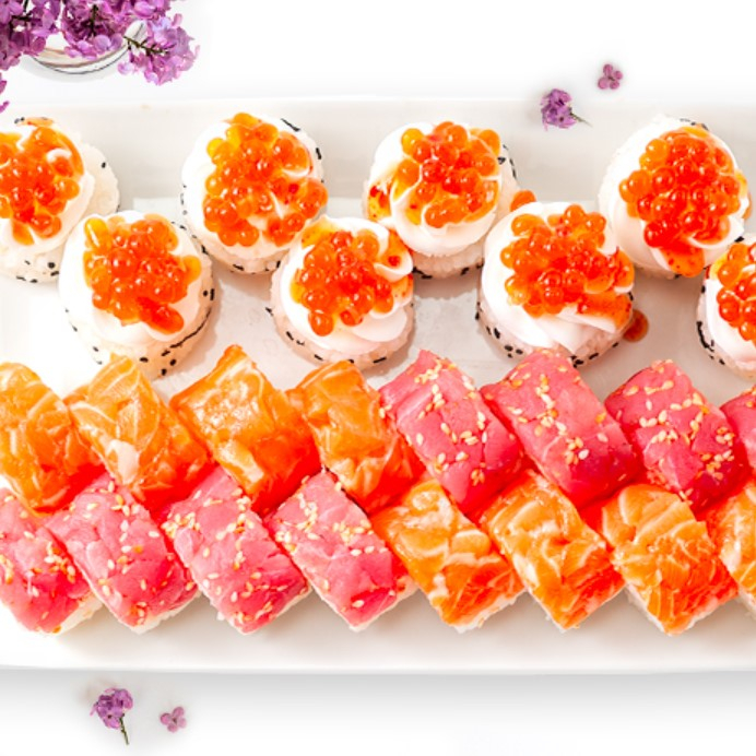 Ролл с авокадо, ролл с морским окунем, ролл с тунцом, ролл с лососем, ролл с угрём с кунжутом и соусом Унаги, ролл с креветкой и сыром, ролл с копчёным лососем и соусом Спайси.