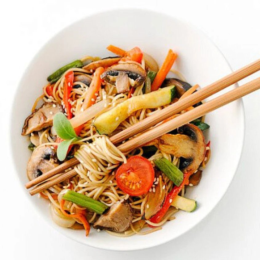 Заказать Шампиньоны, лук красный, морковь, перец болгарский, грибы шиитаки, цукини, масло чесночное, лапша яичная, бульон вок, соус вок, кунжут белый, ростки соевые.