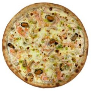 Заказать Сливочная основа, креветки, мидии, кальмар, лосось, оливки, сыр Моцарелла, сыр Пармезан, чесночно-зеленое масло, лимон.