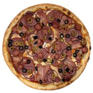 Заказать Томатная основа, сыр Моцарелла, сервелат, охотничьи колбаски, бекон, лук, оливки, маслины.