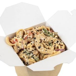 Заказать Лапша пшеничная, курица, болг. перец, лук, спаржа, шампиньоны, чеснок, смесь перцев, тайский соус, кунжут.