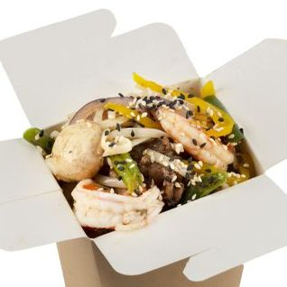 Заказать Лапша пшеничная, креветки, болг. перец, лук, спаржа, шампиньоны, соус терияки, кунжут.